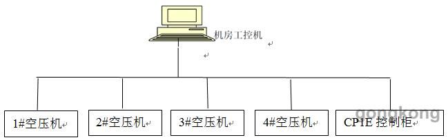 整體結(jié)構(gòu)圖上圖所示,整個結(jié)構(gòu)分成兩層,上半部分是智能監(jiān)控層,下半部分是現(xiàn)場設(shè)備層CP1E 智能監(jiān)控層由PC工控機組成,安裝在計算機房中,用來采集空壓機的各個運行參數(shù),同時遠程監(jiān)視空壓機以及自動放水裝置CP1E 現(xiàn)場設(shè)備層由4個空壓機和1個OMRON的CP1E控制的自動裝置組成,CP1E控制柜,根據(jù)現(xiàn)場工況的需求,自動控制空壓機的運轉(zhuǎn)情況CP1E