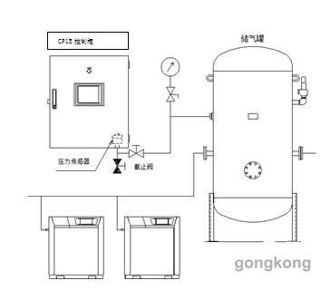 CP1E控制柜還具有無休止循環(huán)運行機能,可對各空壓機的運行時間和啟動次數(shù)進行控制,實現(xiàn)運行時間和啟動次數(shù)的均衡化,使能量的損失更少,容量和臺數(shù)控制運行的效率更高。如下圖示CP1E控制柜和空壓機連接示意圖,必須將CP1E控制柜的壓力信號采集在儲氣罐上,以便于CP1E控制柜采集到更加準(zhǔn)確的壓力信號,方便有效集中控制每個空壓機的運轉(zhuǎn)。
