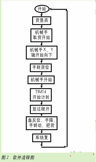 步進電機驅動縱軸上升,另一個步進電機驅動橫軸開始向前走;轉盤直流電機轉動使機械手整體運動,轉到貨物接收處;步進電機再次驅動縱軸下降,到達指定位置后,氣閥放氣,機械手松開貨物;系統回位準備下一次動作。