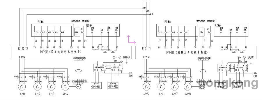 為配合大車運行機構(gòu)工藝要求,兩側(cè)支腿分開用2只功率大小相同的變頻器控制,每只變頻器各驅(qū)動4只11KW變頻電動機,電動機散熱風(fēng)機單獨控制,為防止每只電動機過載,在每臺電動機主回路設(shè)置過熱保護(hù)繼電器,過熱繼電器觸點發(fā)聵到PLC輸入回路,檢測電動機是否過熱,已發(fā)出動作指令。