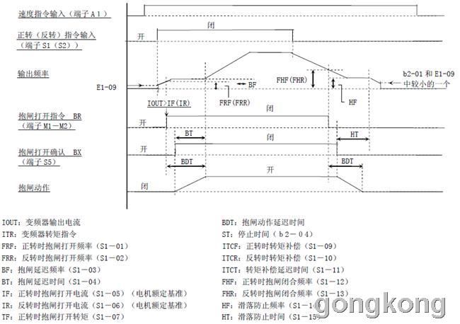 在調試時,若出現溜鉤現象,可適當調高抱閘頻率,但不宜設置過高,否則變頻器易報故障,一般設置在0.3~2Hz內。調試過程需注意以下幾點: