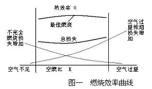 大多數工業鍋爐處于能耗高、浪費大、環境污染等因素,與燃燒有直接關系,從各種燃燒裝置的實際運行都可知道:如果空氣量不足,燃燒不充分,燃燒效率低;但空氣過多也會使排煙帶走的熱量增加,同樣也是不經濟的。根據以上分析知有以下曲線: