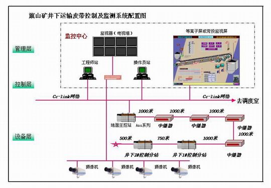 考慮到煤礦的現(xiàn)場情況和控制距離,在地面控制中心設置控制主站,采用三菱的大中型PLC-AnS系列,網(wǎng)絡選用開放的CC-Link總線,在控制距離大于1200米的兩個控制站間要加中繼器,在皮帶機頭設置控制設備分站??刂圃O備分站負責現(xiàn)場的信號采集與現(xiàn)場的實時控制。