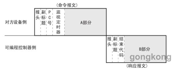 報文命令的具體格式如圖七,圖六中報頭為 TCP/IP 或 UDP/IP用報頭。 在可編程控制器側, 以太網適配器會進行附加、 刪除, 無需用戶設置。副標題為 00H,PC 號為 FFH,監視定時器可設定值為0000H~FFFFH(1~65535) (單位 250ms),A 部分為數據的讀寫命令,結束代碼為對方設備向可編程控制器站進行數據讀出/寫入后的處理結果(00H: 正常結束,00H以外: 異常結束)。