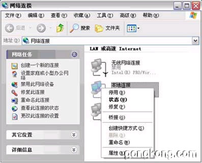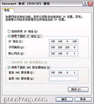 * 設置PC的IP地址:右鍵點擊“網上鄰居”,選擇屬性即進入“網絡連接”窗口,右鍵點擊“本地連接”,選擇屬性即進入“本地連接屬性”窗口,雙擊Internet協議(TCP/IP),修改屬性如下(本例設計算機為192.168.0.188,GP為192.168.0.100)。