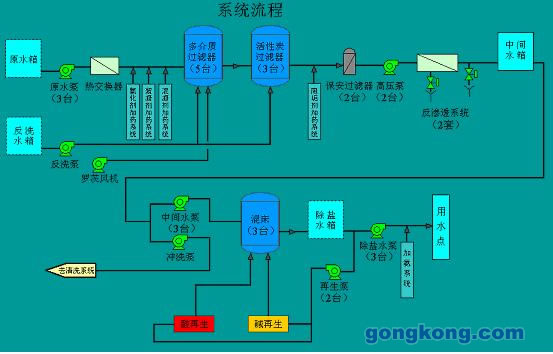 本例根據(jù)原水水質(zhì)條件、鍋爐汽水系統(tǒng)對補給水的水質(zhì)要求,鍋爐補給水處理系統(tǒng)流程為:原水→原水箱→原水泵→熱交換器→多介質(zhì)過濾器→活性炭過濾器→反滲透預(yù)脫鹽系統(tǒng)→中間水箱→中間水泵→混和離子交換床→除鹽水箱→除鹽水泵→主廠房。另外包括過濾器反洗系統(tǒng)、混合離子交換床再生系統(tǒng)、加藥系統(tǒng)等。