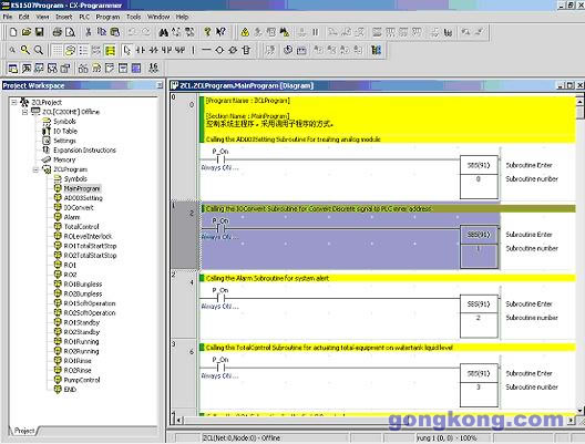 對于OMRON PLC C200HE控制器的編程軟件CX-Programmer來說,通過簡單的指令既可以實現(xiàn)子程序調(diào)用。例如: