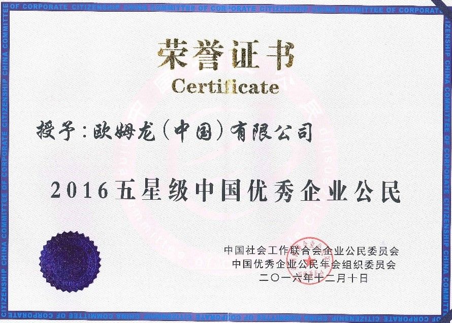 歐姆龍獲評“2016 五星級中國優秀企業公民” 連續五次獲得 “優秀企業公民”稱號