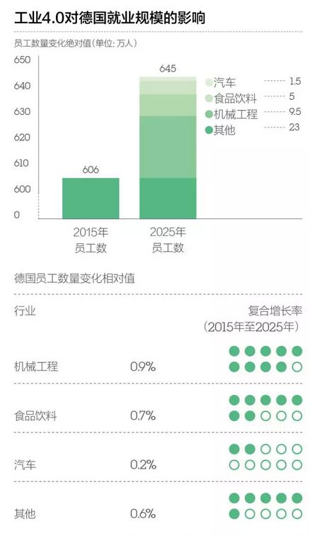 而另一份來自德國聯(lián)邦統(tǒng)計辦公室的數(shù)據(jù)顯示,2015年德國員工數(shù)量絕對值為606萬人,這個數(shù)字到2025年將達645萬人,增長6%。其中機械工程的新增就業(yè)人口最多,達9.5萬人,年均復合增長率為0.9%;食品飲料和汽車行業(yè)的新增數(shù)據(jù)分別為5萬人和1.5萬人,剩余23萬的增長空間來自其他行業(yè)。