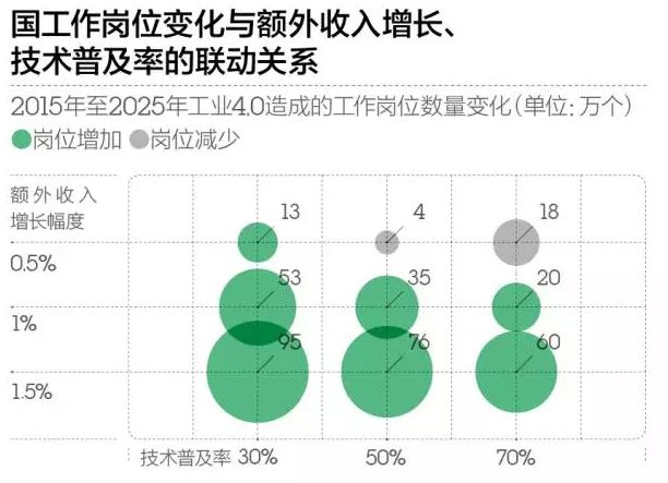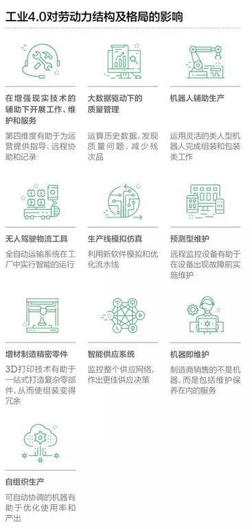 這一趨勢在工業(yè)4.0的進程當中也將持續(xù),生產(chǎn)類崗位將減少12萬個,質(zhì)量管理類崗位將減少2萬個,維護類崗位減少1萬個。簡單來說,那些低技術門檻及高重復率的工作將會受到波及。
