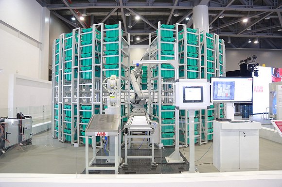在本屆活動(dòng)上,ABB也展出了關(guān)于物流倉儲(chǔ)的新型機(jī)器人——“小型機(jī)器人(IRB1200)+大型機(jī)器人(IRB6700)”的組合應(yīng)用。大機(jī)器人負(fù)責(zé)從上層傳送帶提取料箱,按照指令存入貨架相應(yīng)位置,小機(jī)器人借助3D視覺輔助,拾取箱中物品并放置在下道工序的傳送帶上。