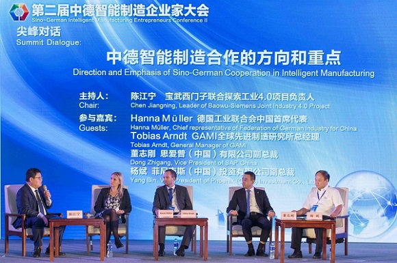 在尖峰對話環(huán)節(jié),寶武西門子聯(lián)合探索工業(yè)4.0項目負責(zé)人陳江寧、德國工業(yè)聯(lián)合會中國首席代表Hanna Müller、GAMI全球先進制造研究所總經(jīng)理 Tobias Arndt、思愛普(中國)有限公司副總裁 董志剛、菲尼克斯(中國)投資有限公司副總裁楊斌圍繞“中德智能制造合作的方向和重點”展開了深入討論。