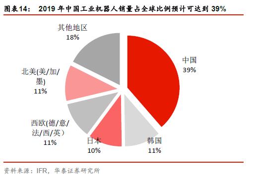 根據國際機器人聯合會報告預計中國制造,2017年至2020年,全球工業機器人年均銷量增速為12%;同時期中國工業機器人年均銷量增速將達到21%。到2019年,中國工業機器人銷量占全球的比例將達到39%,遠超其他國家和地區。