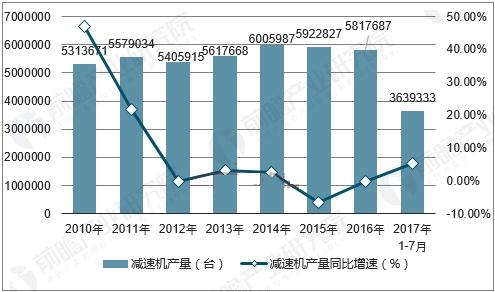我國減速機產(chǎn)量于2010-2015年總體呈增長趨勢。據(jù)前瞻數(shù)據(jù)庫顯示,2016年中國減速機產(chǎn)量為581.8萬臺,同比下降0.26%。2017年1-7月中國減速機產(chǎn)量為363.9萬臺,同比增長5.3%;其中,7月全國減速機產(chǎn)量為55.3萬臺,當月同比增速4.44%。