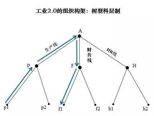 科層組織下的每一個節點都形成了信息孤島或半孤島。設想一下,如果P1和F1之間要溝通,P1首先要向直接上級生產經理P報告,P是一個半孤島,他如果要進入財務線,就要先向上到總經理A,由A再去聯系財務經理,財務經理再去聯系下面的F1。